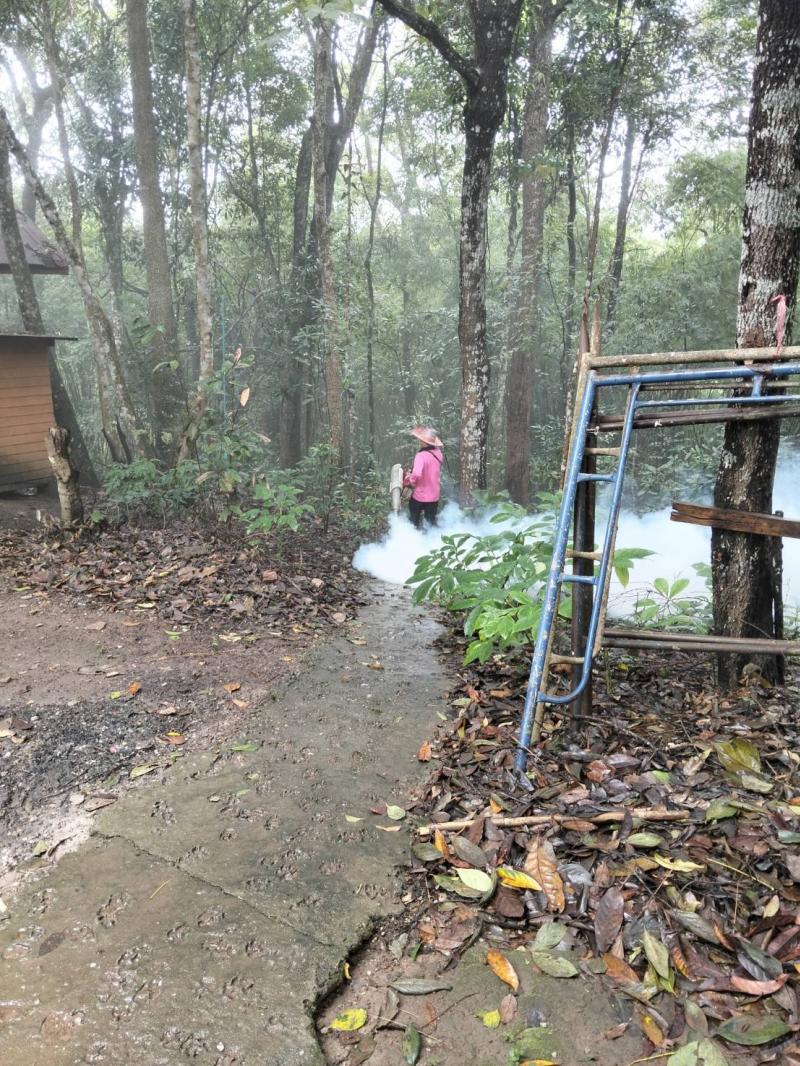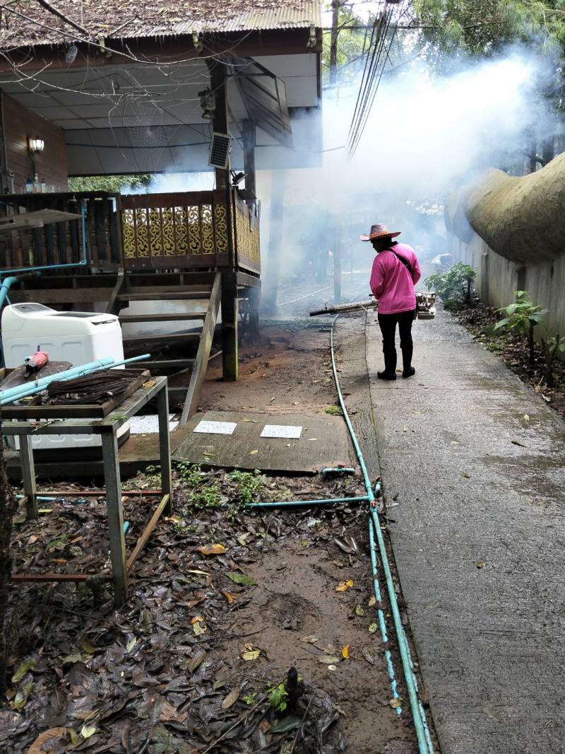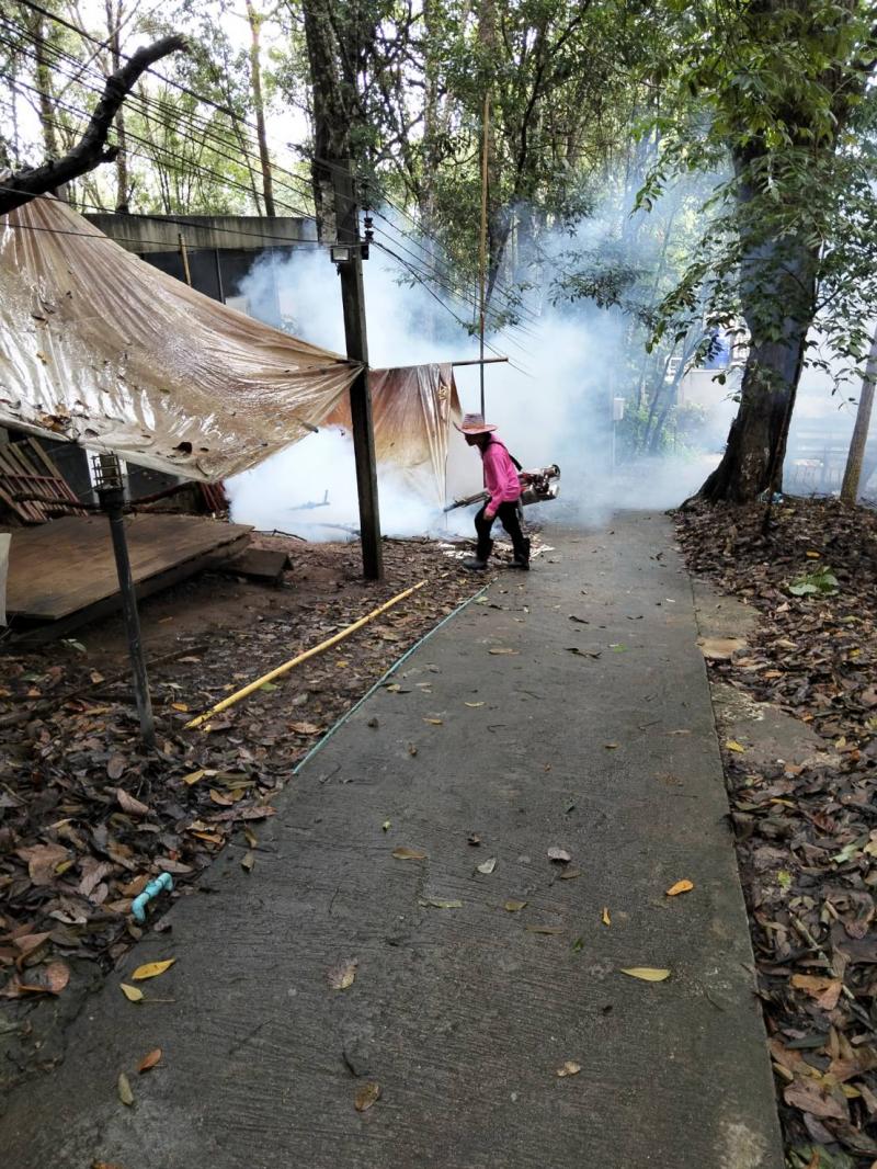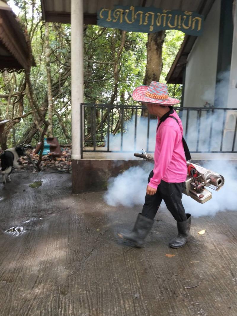 กองสาธารณสุขและสิ่งแวดล้อม อบต.วังบาล ดำเนินการพ่นหมอกควันกำจัดยุงลาย เคสใหม่ วัดป่าภูทับเบิก