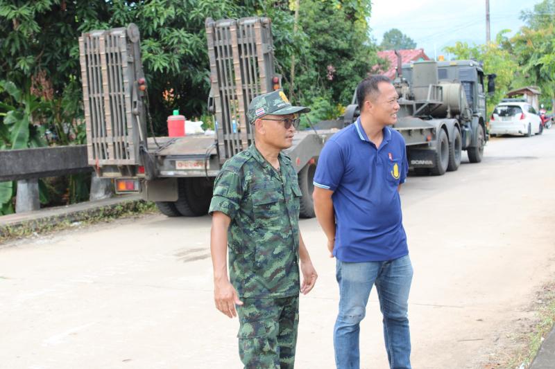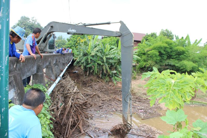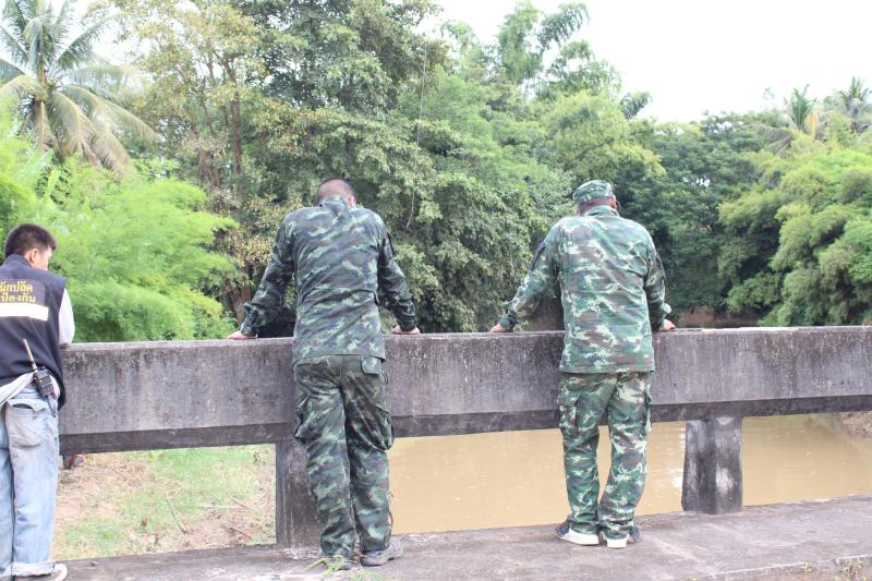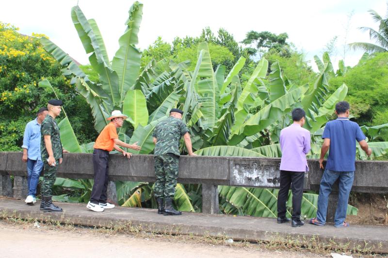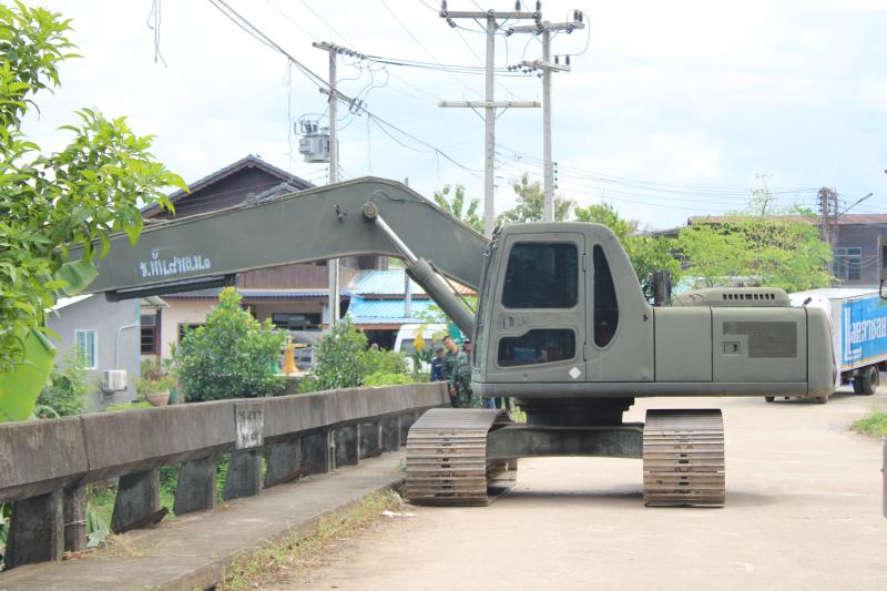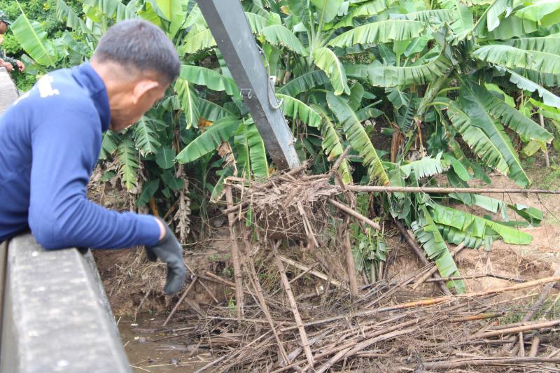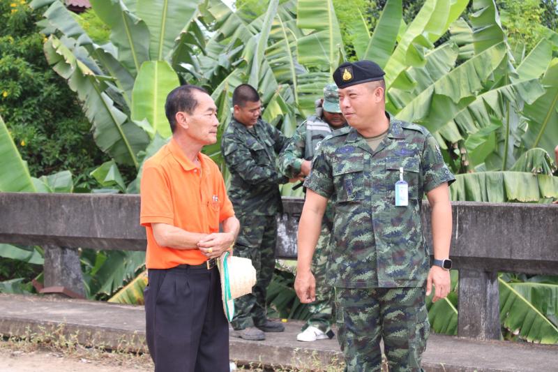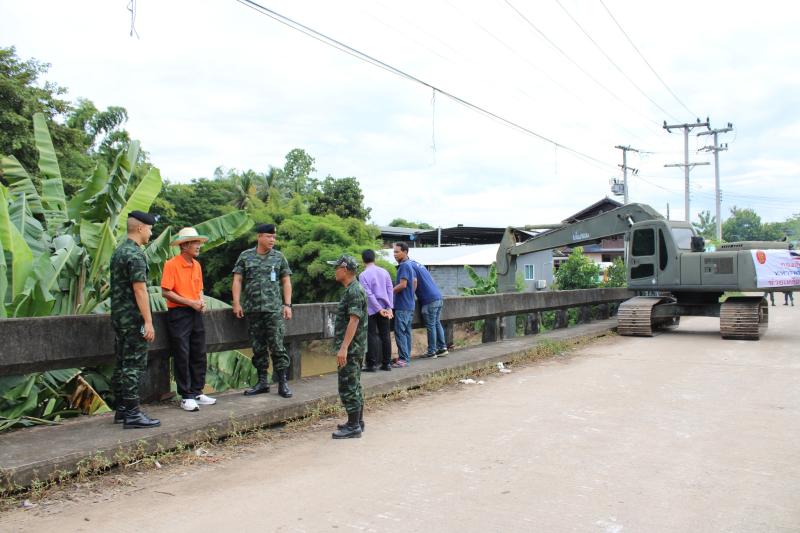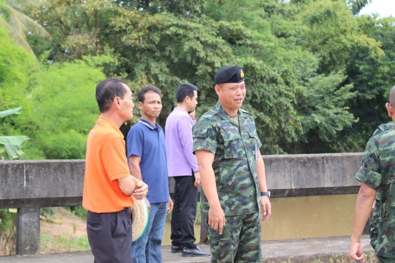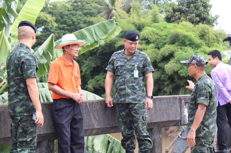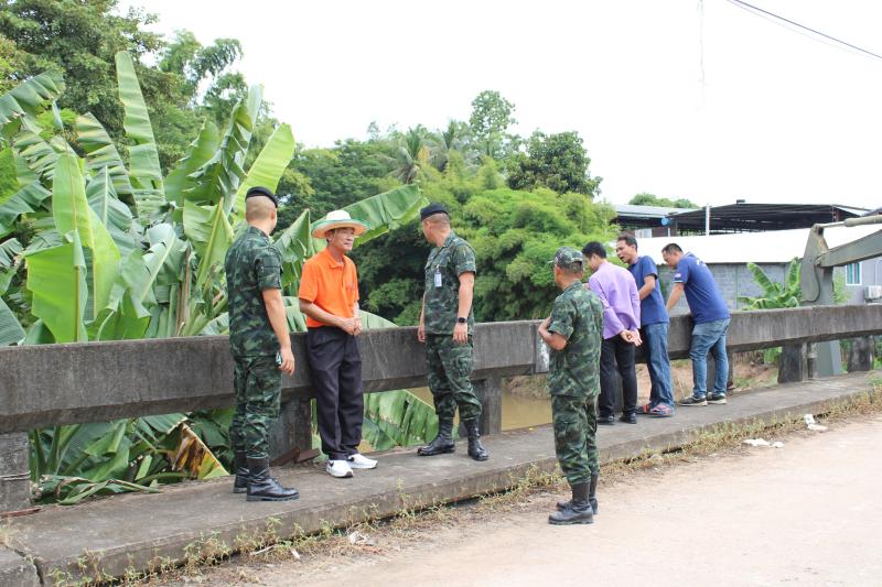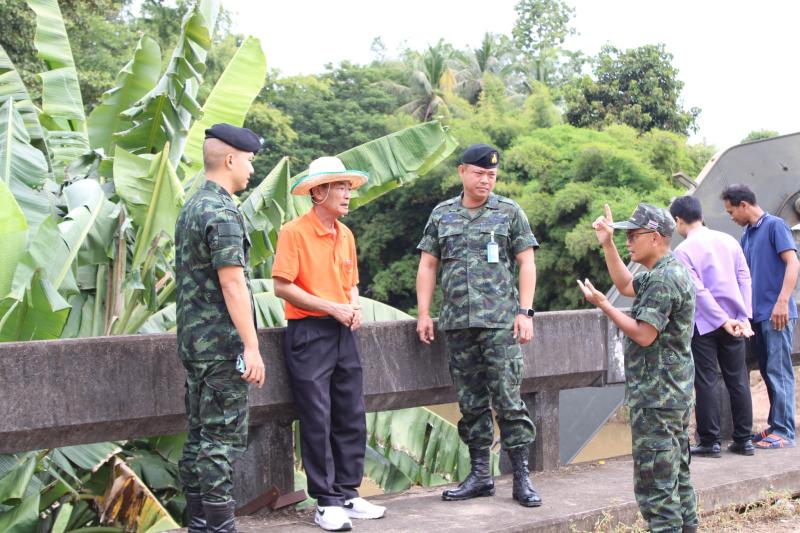 ลงพื้นที่บริเวณสะพานหมู่ 4 ติดตามการกำจัดสิ่งกีดขวางเส้นทางน้ำ ตามการขอรับสนับสนุนเครื่องจักรกลหนักของกองพันทหารช่างที่ 8 กองพลทหารม้าที่ 1