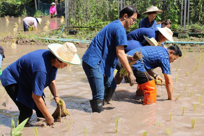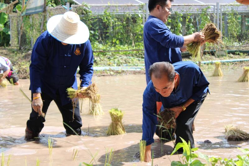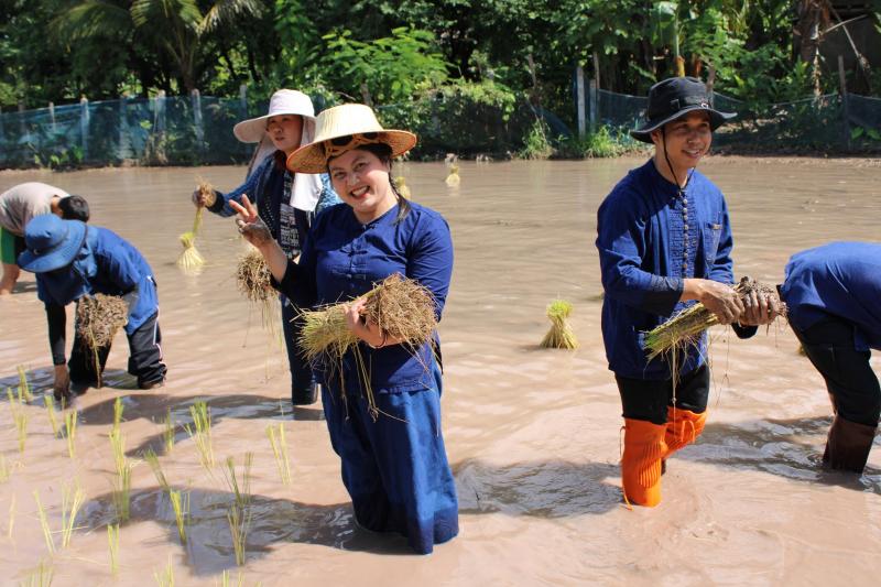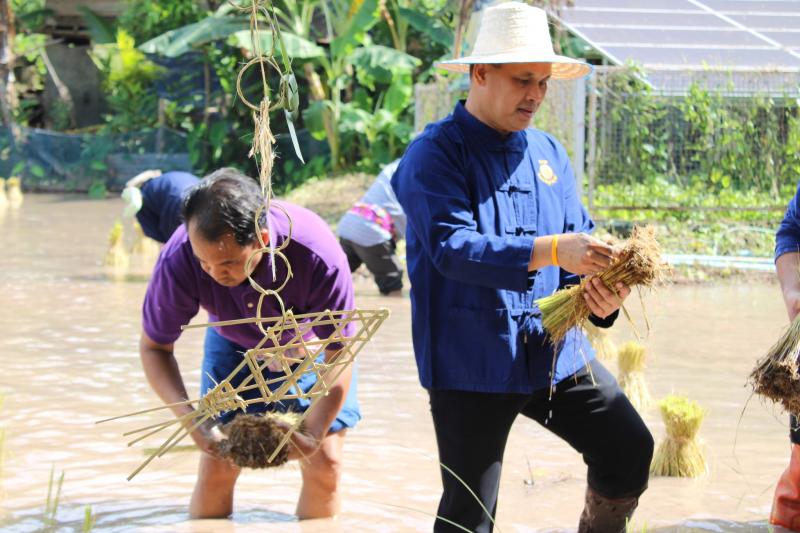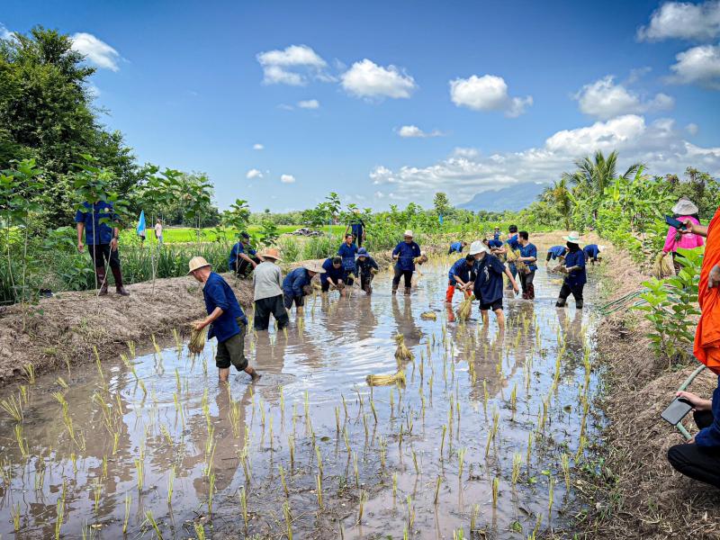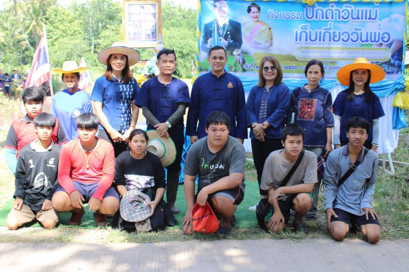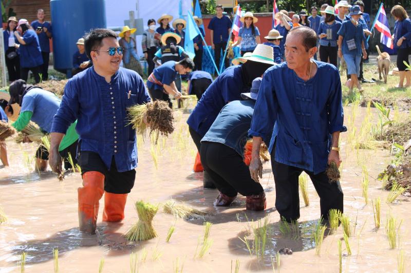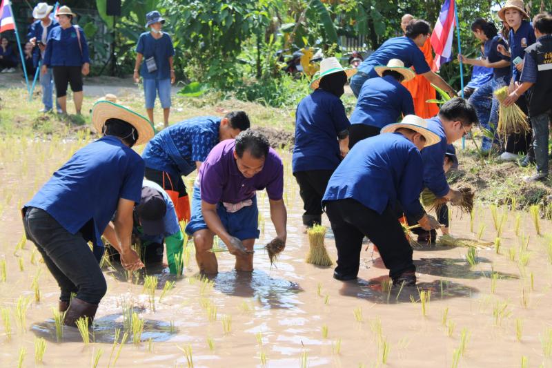 กิจกรรมดำนาข้าว ก้าวตามรอยพ่อ "ปักดำวันแม่ เก็บเกี่ยววันพ่อ" เนื่องในโอกาสมหามงคลวันเฉลิมพระชนมพรรษาพระบรมราชชนนีพันปีหลวง ณ แปลงนาพันธุ์ข้าวสาธิต วัดศรีฐานปิยาราม