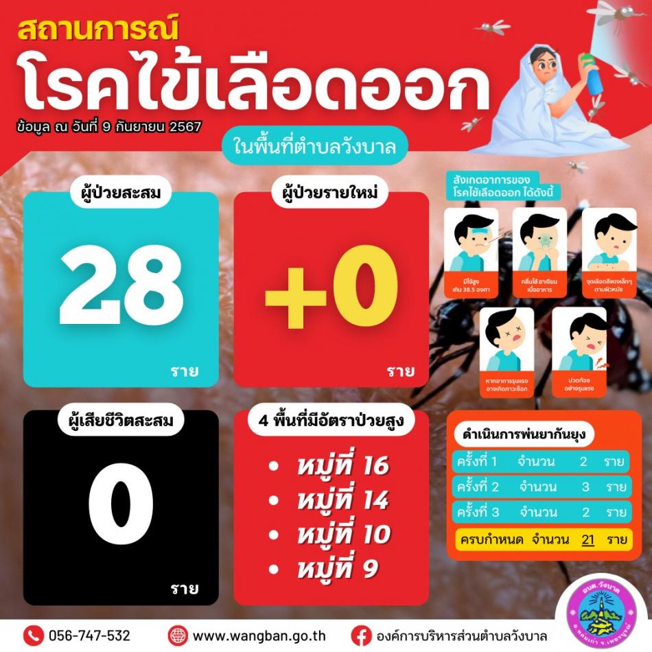 รายละเอียด : วันที่ 9 กันยายน พ.ศ.2567 กองสาธารณสุขและสิ่งแวดล้อม อบต.วังบาล ได้ดำเนินการพ่นหมอกควันกำจัดยุงลาย สนับสนุนให้กับเคสผู้ป่วยรายเดิม ในพื้นที่หมู่ที่ 11 จำนวน 1 ราย (ครั้งที่ 2)