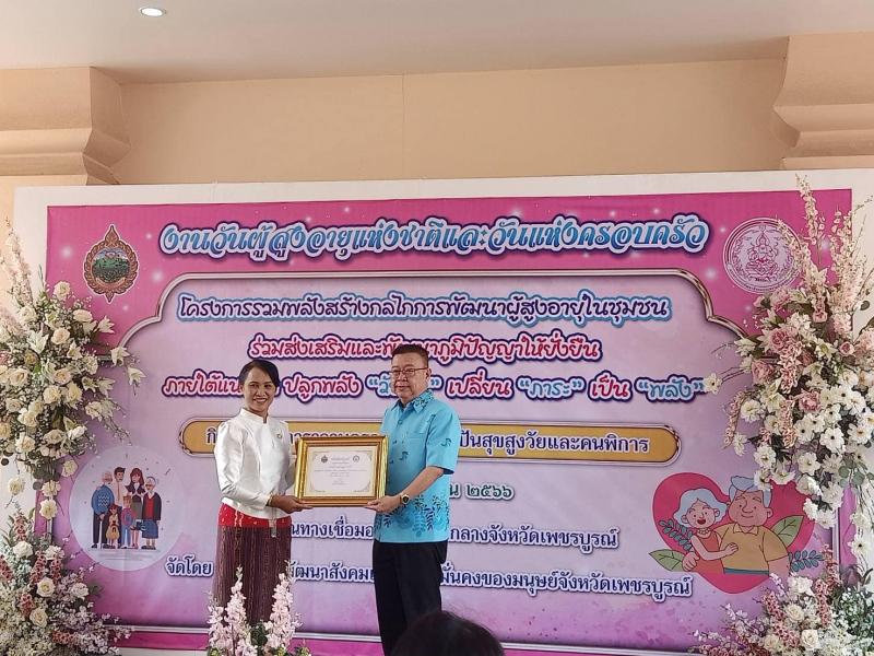 รายละเอียด : วันที่ 21 เมษายน 2566 องค์การบริหารส่วนตำบลวังบาล ภายใต้การบริหารงานโดย นายสุขเสริญ บัวอินทร์ นายกองค์การบริหารส่วนตำบลวังบาล มอบหมายให้นางราตรี ราชพรหมมินทร์ ผู้อำนวยการกองสวัสดิการสังคม และนางสาวไพรริน บุญพรม นักวิชาการพัฒนาขุมชน ร่วมงานวันผู้สูงอายุแห่งชาติและวันแห่งครอบครัว ณ ศาลากลางจังหวัดเพชรบูรณ์ ทั้งนี้ องค์การบริหารส่วนตำบลวังบาลขอแสดงความยินดีเป็นอย่างยิ่ง กับรางวัลทั้ง 3 รายการ ได้แก่ นางไพรัตร โสภาบุญ รับโล่ประเภทบุคคลดีเด่นด้านการพัฒนาครอบครัว นางสาวนงนุช แก้วกลิ้ง รับประกาศนียบัตรประเภทครอบครัวร่มเย็น และโรงเรียนสร้างสุขผู้สูงอายุวัดศรีฐานปิยาราม รับประกาศนียบัตรประเภทชมรมผู้สูงอายุแข้มแข็ง