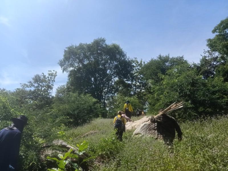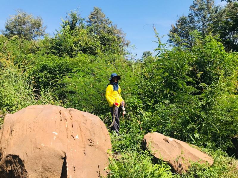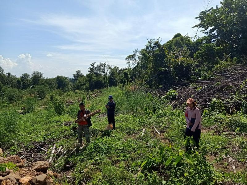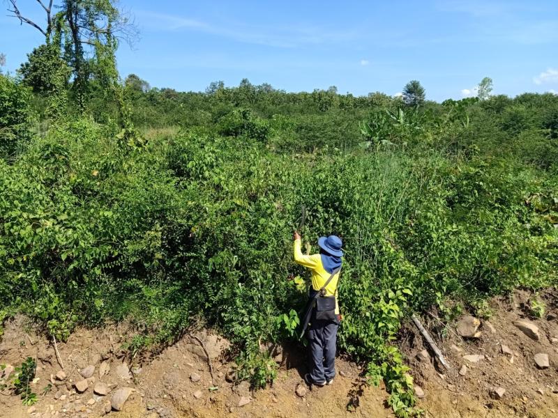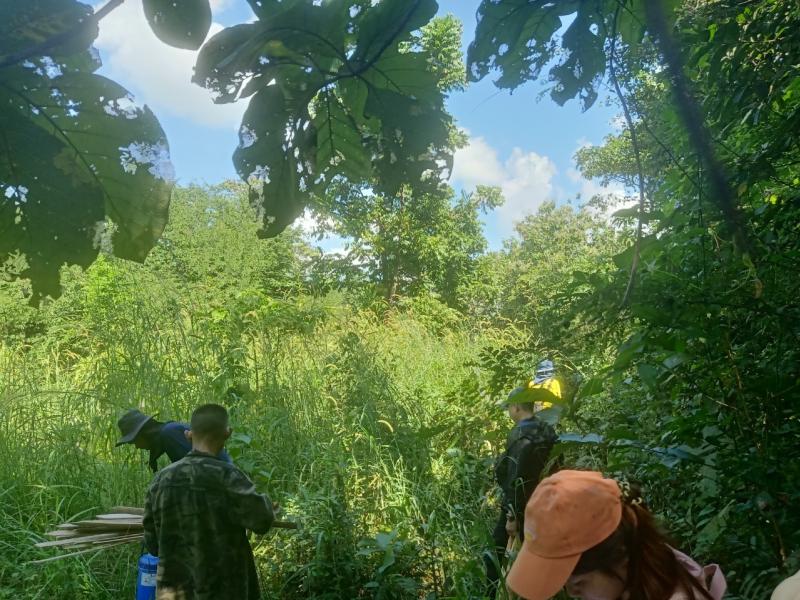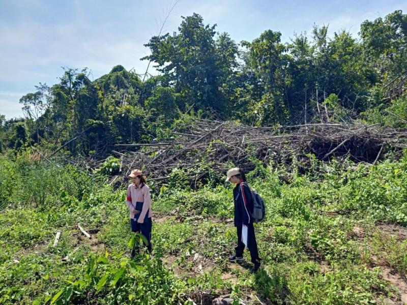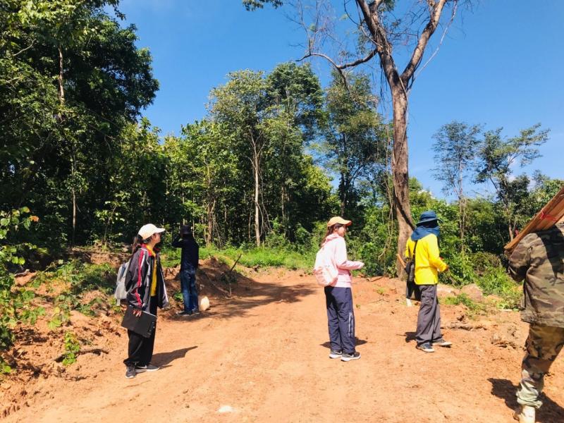 เดินสำรวจพื้นที่พร้อมปักหมุดรอบแปลงบ่อขยะ เพื่อทำเป็นสถานที่กำจัดขยะมูลฝอย