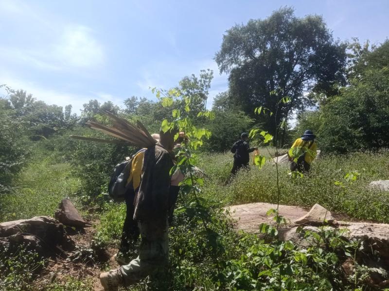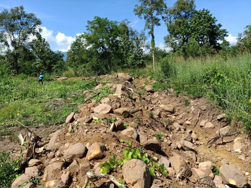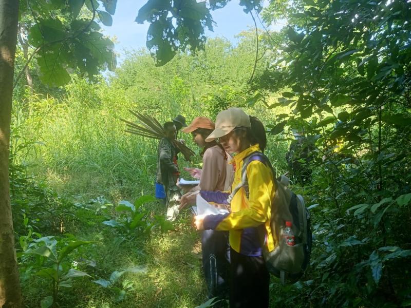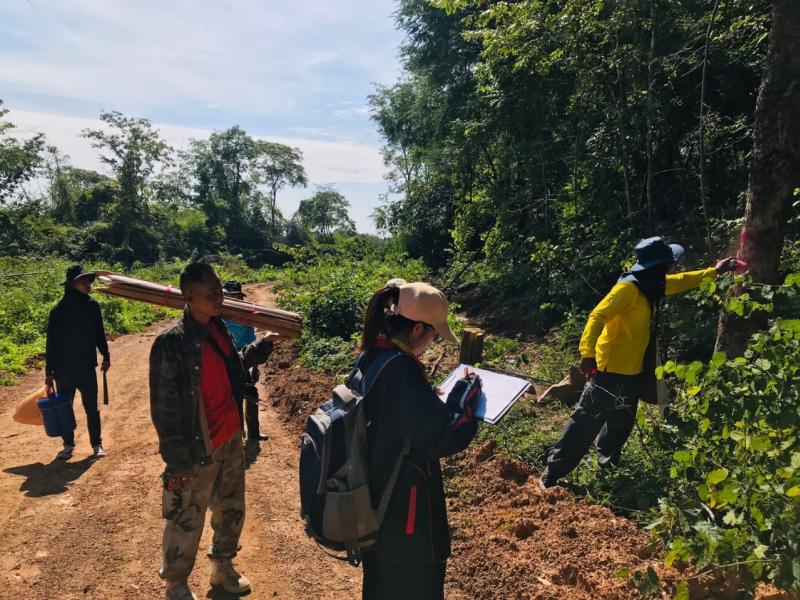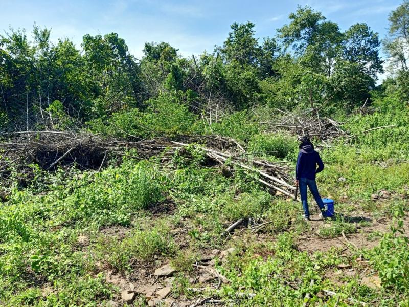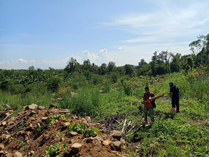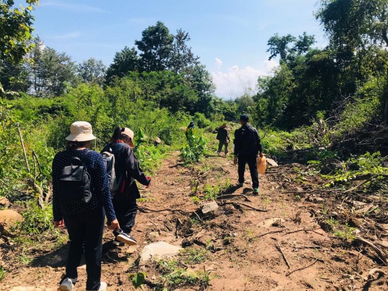 เดินสำรวจพื้นที่พร้อมปักหมุดรอบแปลงบ่อขยะ เพื่อทำเป็นสถานที่กำจัดขยะมูลฝอย