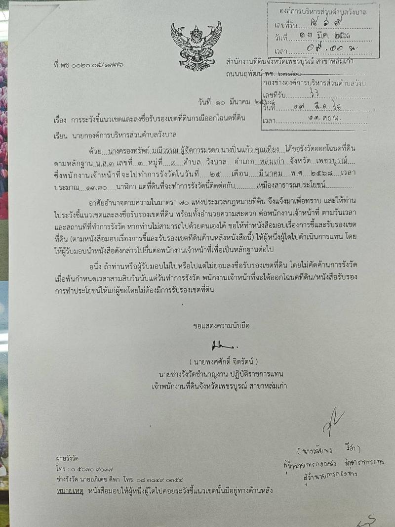 รายละเอียด : วันอังคารที่ 25 มีนาคม 2568 นายพนม หาหล้า นายช่างโยธา องค์การบริหารส่วนตำบลวังบาล พร้อมด้วยเจ้าหน้าที่จากกรมป่าไม้, เจ้าหน้าที่สำนักงานที่ดินอำเภอหล่มเก่า, เจ้าหน้าที่จากกระทรวงการพัฒนาสังคมและความมั่นคงของมนุษย์ (พม.) และผู้นำหมู่บ้านหมู่ที่ 9 ได้ร่วมกันลงพื้นที่เพื่อตรวจสอบและรับรองแนวเขตที่ดิน สำหรับการดำเนินการออกโฉนดที่ดินให้เป็นไปตามระเบียบและหลักเกณฑ์ที่ถูกต้อง การดำเนินงานในครั้งนี้มุ่งเน้นให้แนวเขตที่ดินมีความชัดเจน ถูกต้องตามหลักฐานที่ดิน และเป็นไปตามข้อกำหนดของหน่วยงานที่เกี่ยวข้อง เพื่ออำนวยความสะดวกให้แก่ประชาชนในกระบวนการออกโฉนดที่ดิน ภายหลังจากการตรวจสอบ เจ้าหน้าที่และผู้เกี่ยวข้องได้ร่วมกันลงนามรับรองแนวเขตที่ดิน เพื่อใช้เป็นข้อมูลอ้างอิงสำหรับการดำเนินการในขั้นตอนต่อไป