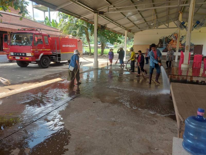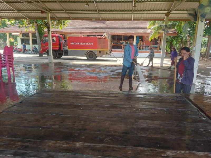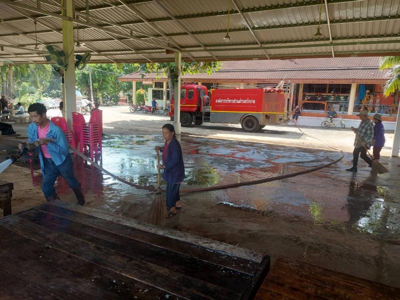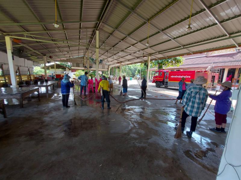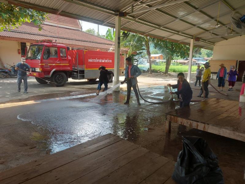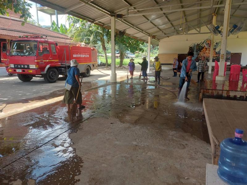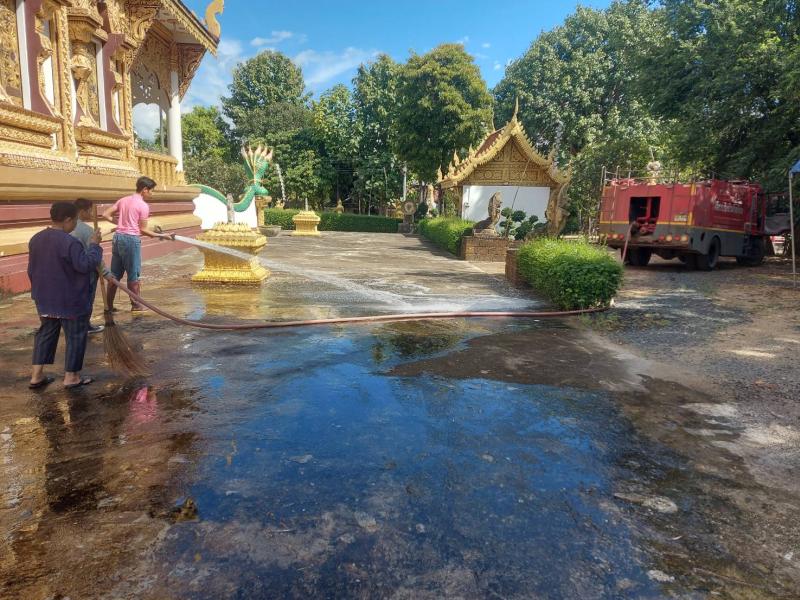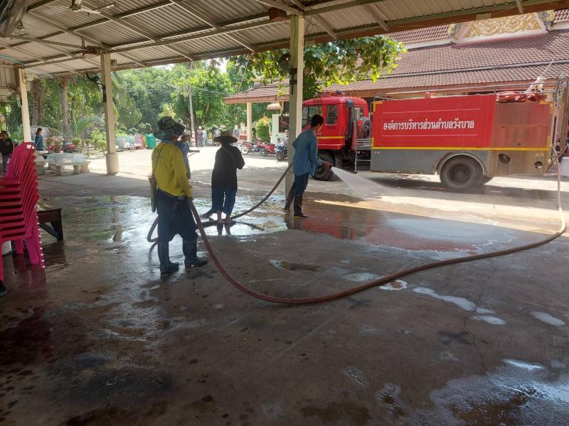 นำรถบรรทุกน้ำออกทำความสะอาดเมรุบ้านเหมืองแบ่ง วัดโพนทอง และถนนภายในหมู่บ้านเหมืองแบ่ง