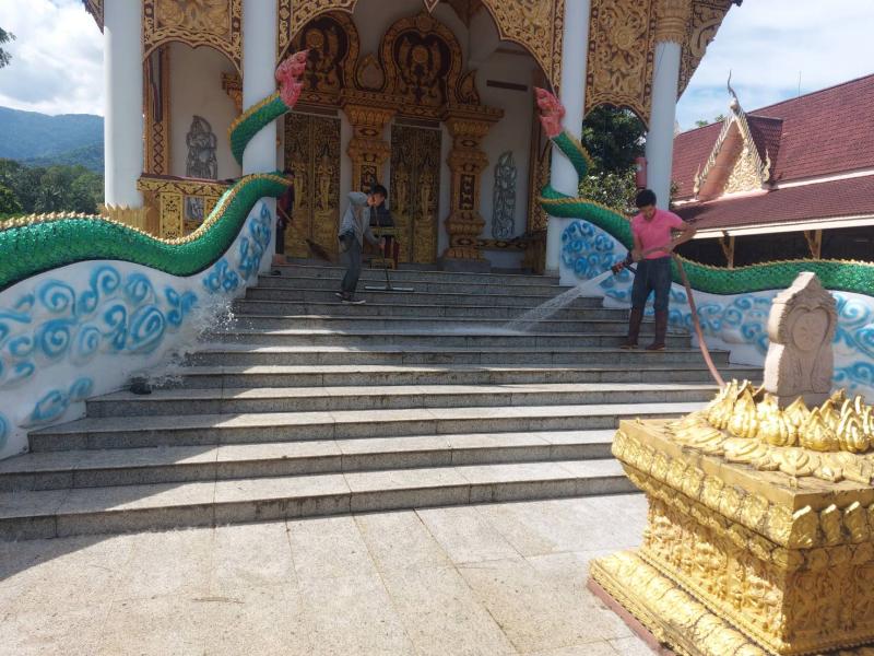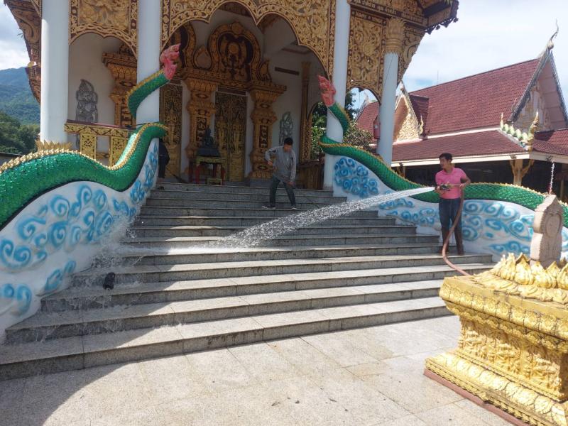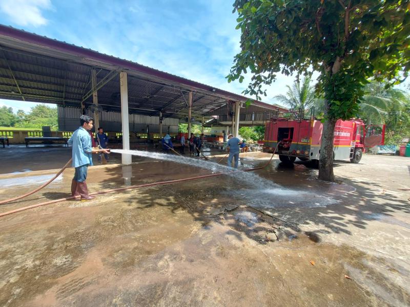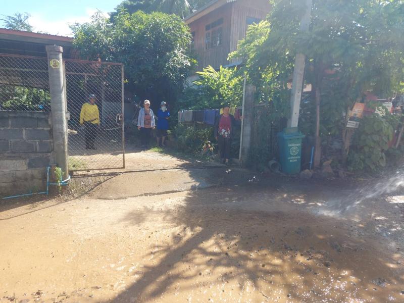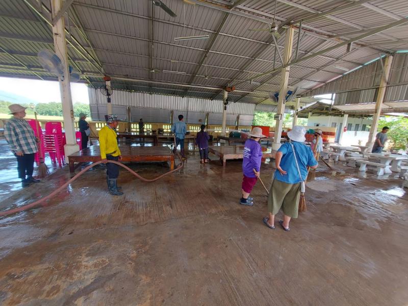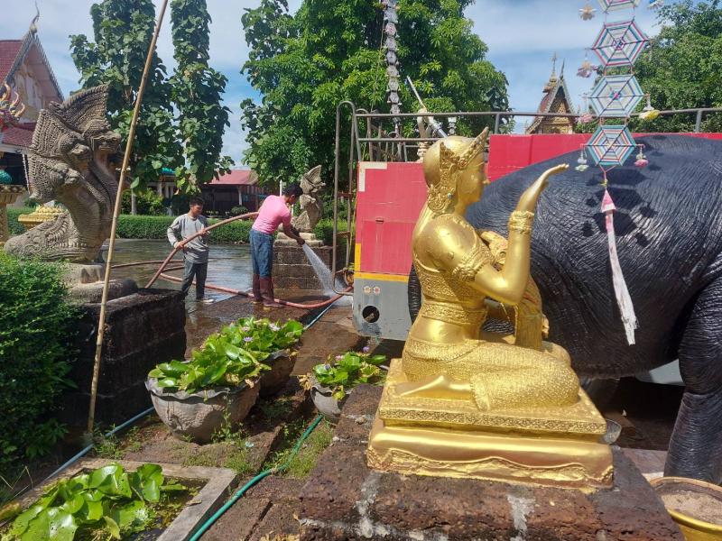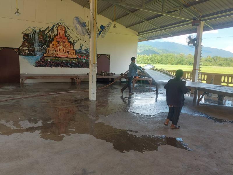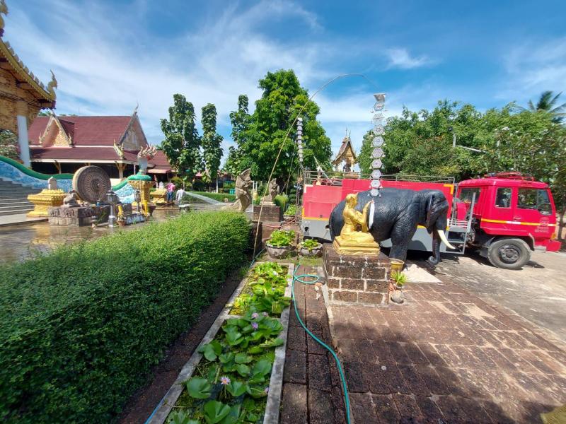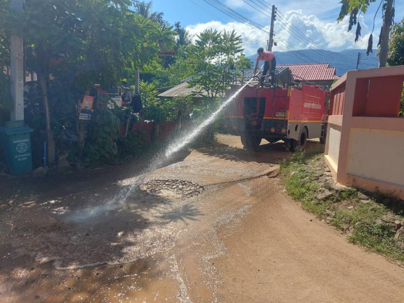 นำรถบรรทุกน้ำออกทำความสะอาดเมรุบ้านเหมืองแบ่ง วัดโพนทอง และถนนภายในหมู่บ้านเหมืองแบ่ง