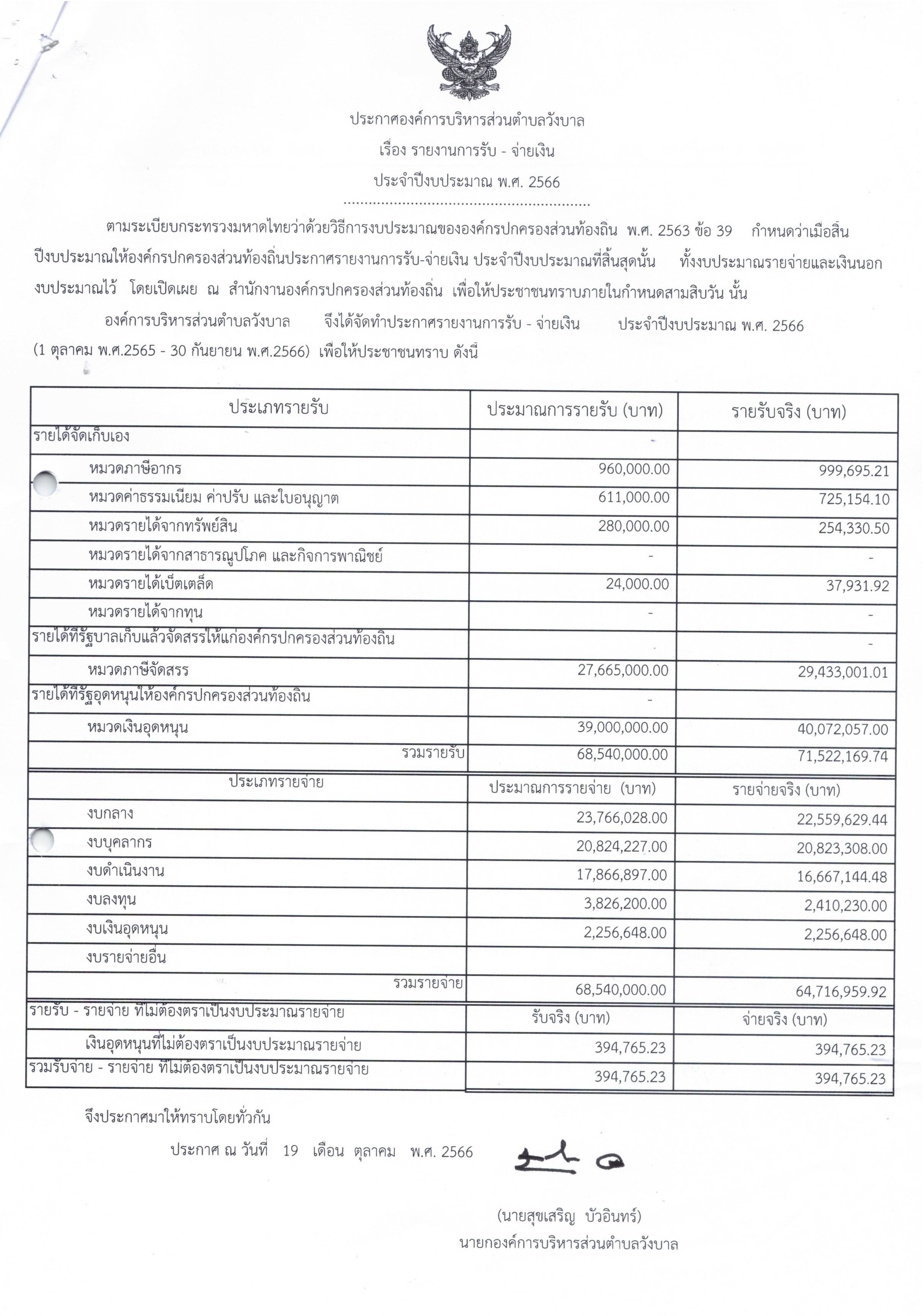 ประกาศ องค์การบริหารส่วนตำบลวังบาล รายงานการรับ-จ่ายเงิน ประจำปีงบประมาณ 2566