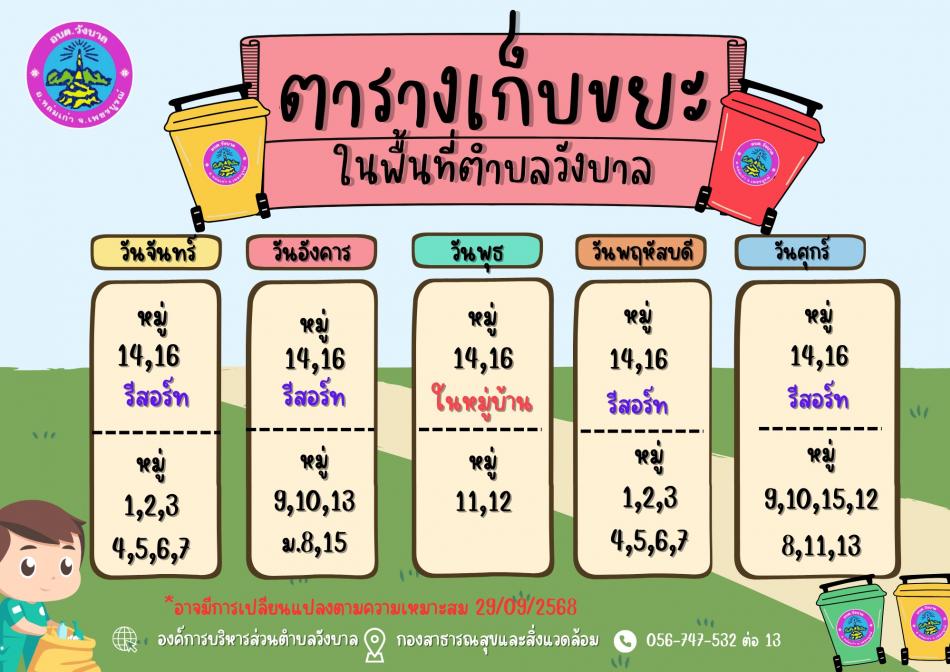 รายละเอียด : ประชาสัมพันธ์ จากกองสาธารณสุขและสิ่งแวดล้อม เรื่อง ตารางการจัดเก็บขยะในพื้นที่ตำบลวังบาลเนื่องด้วย กองสาธารณสุขและสิ่งแวดล้อม ได้เปลี่ยนแปลงตารางการจัดเก็บขยะในเขตพื้นที่ตำบลวังบาล โดยเริ่มตั้งแต่วันที่ 29 กันยายน 2568 เป็นต้นไป เพื่อแจ้งและประชาสัมพันธ์ให้ประชาชนในพื้นที่ตำบลวังบาล รับทราบโดยทั่วถึงกัน(*) หมายเหตุ : กำหนดการข้างต้นอาจมีการเปลี่ยนแปลงตามความเหมาะสม