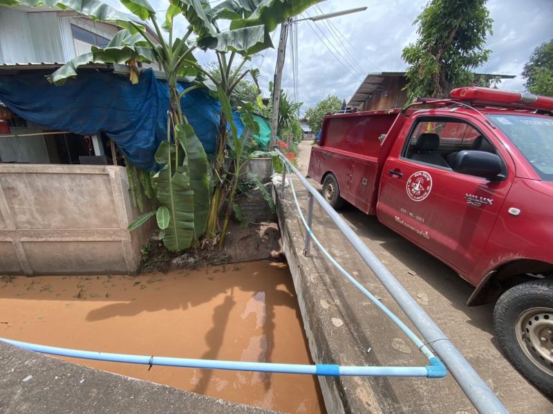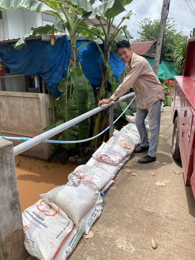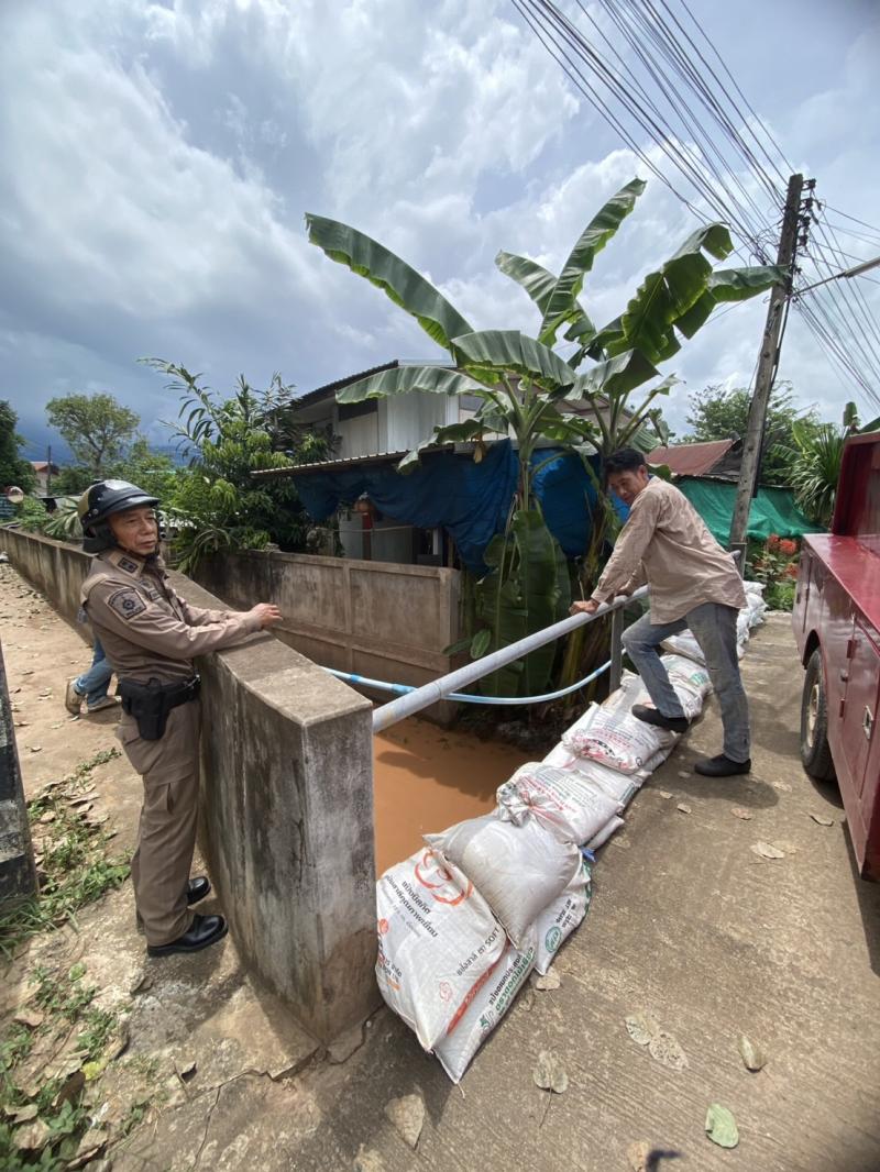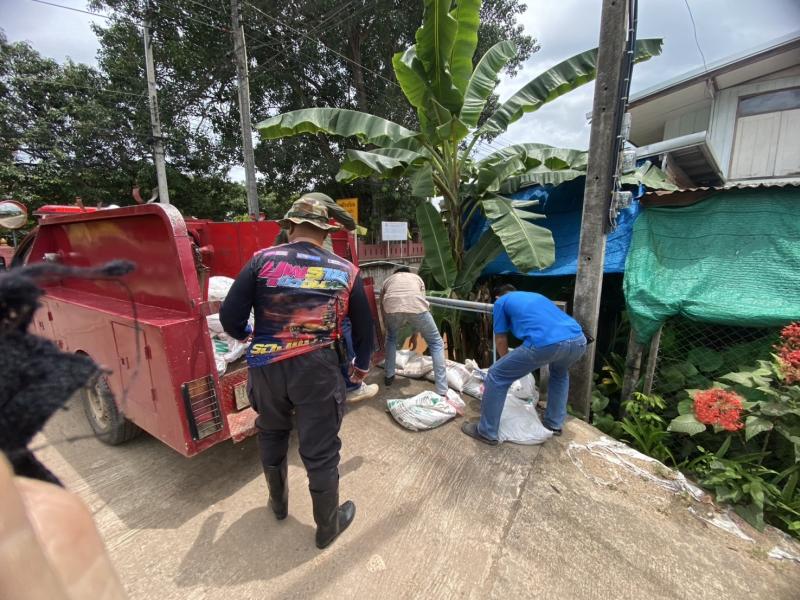 งานป้องกันและบรรเทาสาธารณภัย อบต.วังบาล วางกระสอบทรายป้องกันน้ำเอ่อล้นเข้าพื้นที่ชุมชน