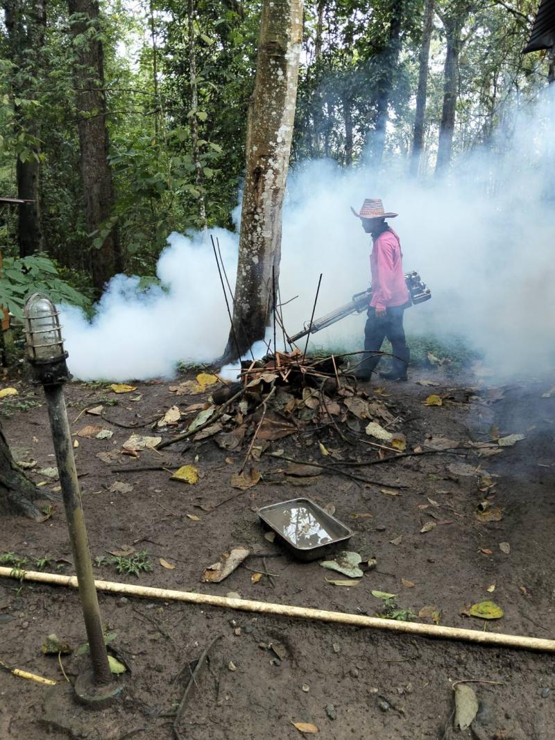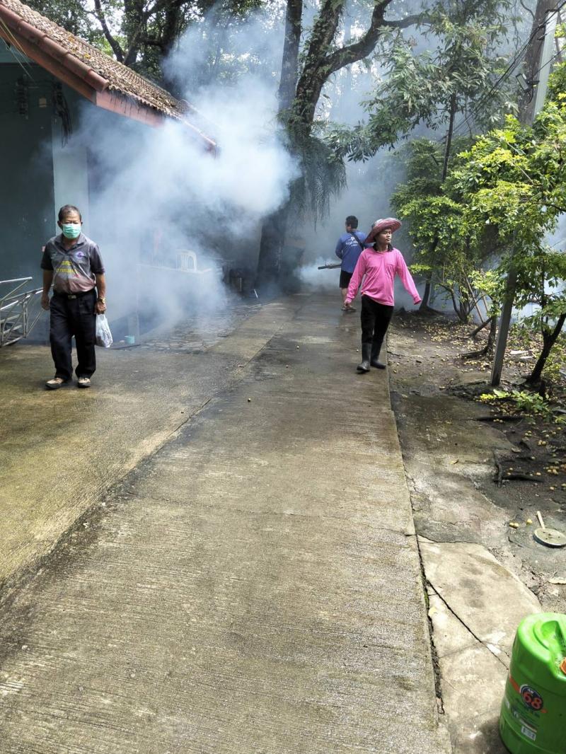 กองสาธารณสุขและสิ่งแวดล้อม อบต.วังบาล ดำเนินการพ่นหมอกควันกำจัดยุงลาย เคสใหม่ วัดป่าภูทับเบิก