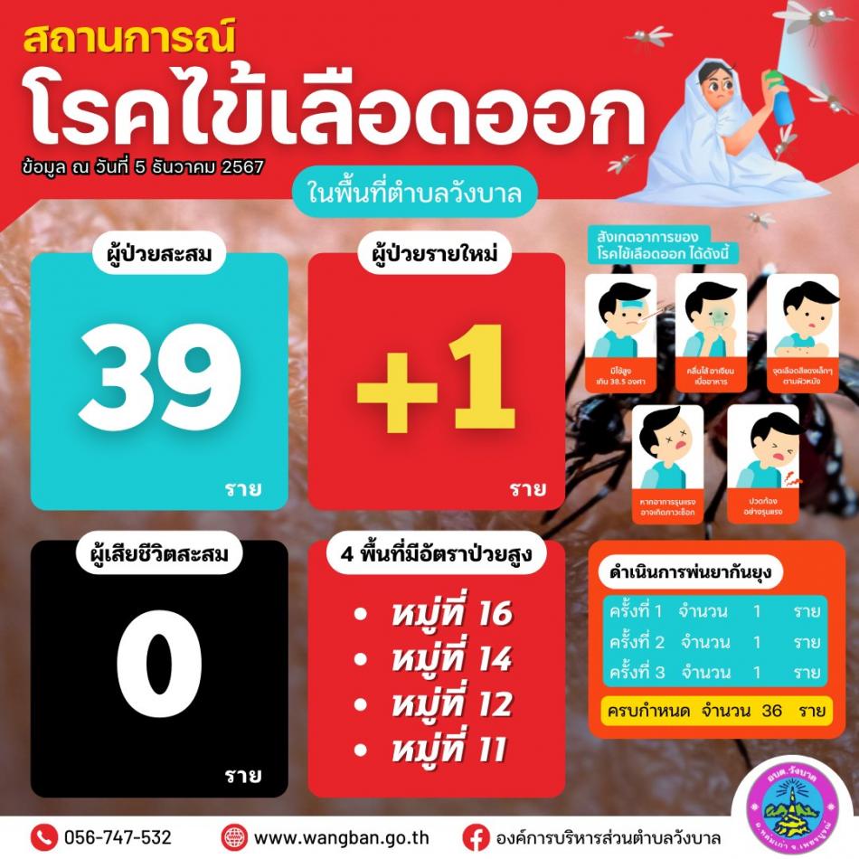 รายละเอียด : วันที่ 6 ธันวาคม พ.ศ.2567 กองสาธารณสุขและสิ่งแวดล้อม อบต.วังบาล ร่วมกับสำนักงานสาธารณสุขอำเภอหล่มเก่า และผู้นำชุมชนในพื้นที่หมู่ที่ 14 และ 16 บ้านทับเบิก ดำเนินการพ่นหมอกควันกำจัดยุงลาย สนับสนุนให้กับเคสผู้ป่วยรายใหม่และรายเดิม ในพื้นที่หมู่ที่ 16 จำนวนทั้งสิ้น 3 ราย และร่วมดำเนินการรณรงค์กำจัดยุงลาย เพื่อป้องกันการเกิดโรคไข้เลือดออกในชุมชน