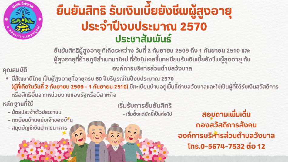 ประชาสัมพันธ์ ยืนยันสิทธิรับเงินเบี้ยยังชีพผู้สูงอายุ ประจำปีงบประมาณ 2570 [15 ตุลาคม 2568]